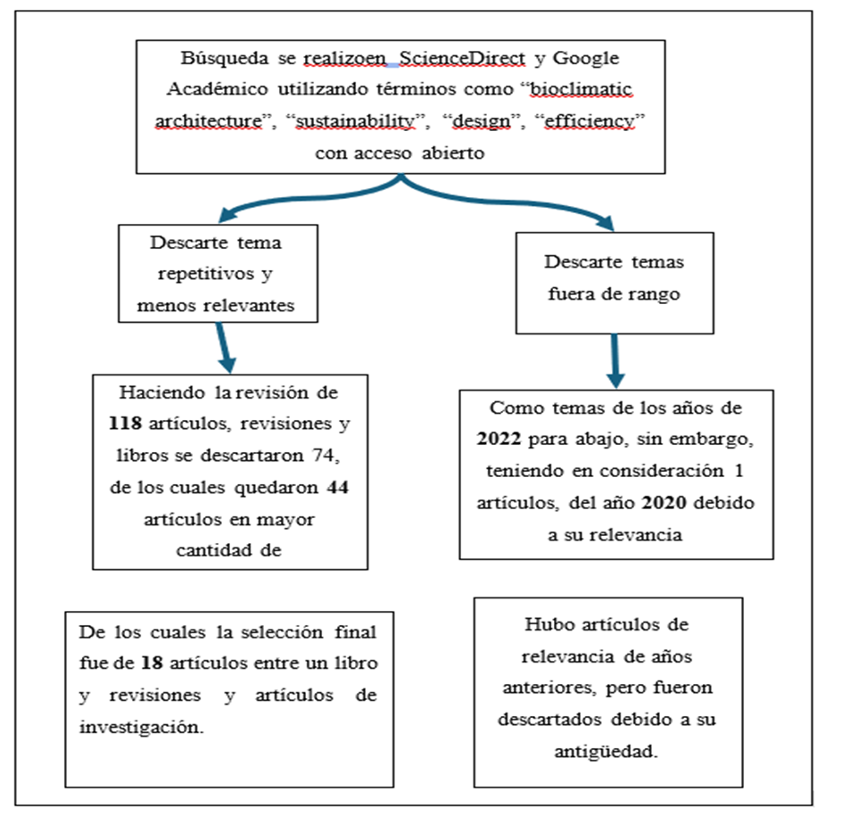 Se llevó a cabo una revisión narrativa exhaustiva con el objetivo de describir la producción empírica y conceptual sobre la arquitectura bioclimática (AB), utilizando referencias empíricas y documentos académicos para proporcionar una visión de las investigaciones actuales sobre el tema. La búsqueda se realizó en la base de datos Scopus, ScienceDirect y Google Académico utilizando una búsqueda refinada con términos en inglés como “bioclimatic architecture”, “sustainability”, “design”, “efficiency” y en español como ¨diseño bioclimático¨, ¨arquitectura bioclimática¨, ¨confort térmico¨, ¨sostenibilidad + arquitectura¨, ¨eficiencia energética¨ en el área delimitada de arquitectura y medio ambiente encontrándose más información buscando en inglés, sin embargo se encontraron artículos de años anteriores al 2022 de relevancia pero fueron descartadas debido a su antigüedad.