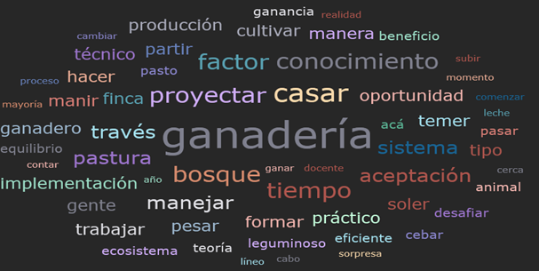 The producer associates the livestock production process with the need to seek and implement strategies that make these conventional models more efficient and in line with the context of the region. In this sense, we were able to identify a series of variables associated with their livestock system, including “livestock,” “forest,” “ecosystem,” “system,” “knowledge,” “balance,” “research,” “implementation,” “time,” “production,” and “acceptance.”