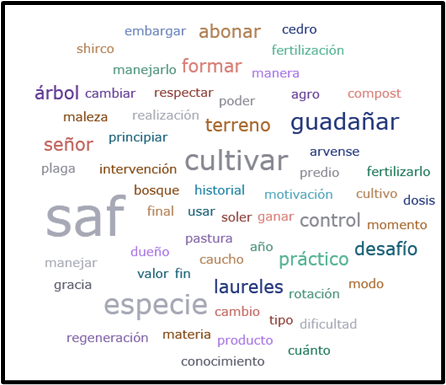Con ayuda del programa de tratamiento de datos cualitativos (Atlas TI), en un primer nivel de análisis se puede apreciar (figura 2), que el productor relaciona la construcción del SAF, con el ejercicio de cultivar, y las prácticas de manejo que en este acontece, por ejemplo guadañar, control, y los procesos de fertilización enunciados con la palabra abonar. Para (9) un manejo mecánico y sin uso químicos en arvenses favorece un mejor comportamiento integral, desde el punto de vista de control, ambiental y económico.