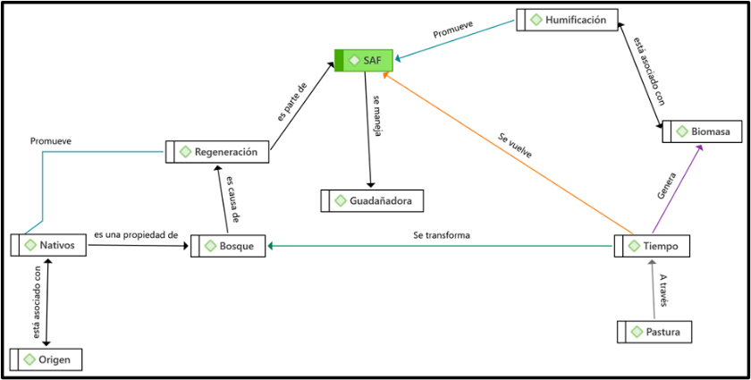 Implementación ecológica del SAF: De acuerdo con lo expresado por el entrevistado, la configuración del SAF, arranca desde que el lote era una pastura, esta fue dejada en proceso de recuperación, a través de la regeneración pasiva. En línea con lo anterior (10) plantean que se ha demostrado que la regeneración natural es eficaz en los procesos de mejoramiento de la calidad del suelo visibles en parámetros como la densidad aparente, la porosidad y la macrofauna y mesofauna edáfica, lo que incrementa a su vez la presencia de los indicadores de la calidad del suelo.