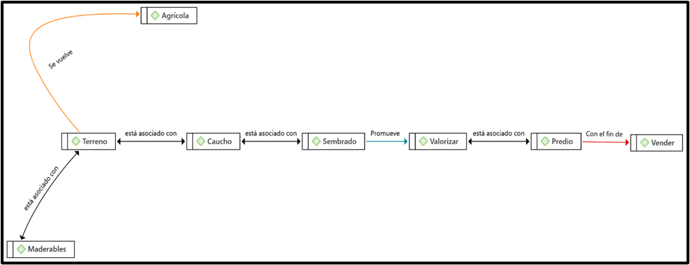 Según lo que expresó el entrevistado, el terreno se fue asociando con especies maderables nativas de la zona, tras el periodo de recuperación; para (13) el proceso natural de reproducción y renovación de los árboles es fundamental para preservar las poblaciones de estas especies, así como para mantener la riqueza y variedad de especies presentes en los bosques de zonas tropicales. El caucho fue sembrado, dándole nuevamente un uso agrícola, con el objetivo de valorizar el predio para posteriormente venderlo a un mejor precio, según (14) los sistemas agroforestales con caucho no solo permiten mayores ingresos, sino que también ofrecen ventajas ambientales; al integrar diferentes especies vegetales, se promueve la biodiversidad y se crean hábitats más diversos para la fauna silvestre. (figura 4).