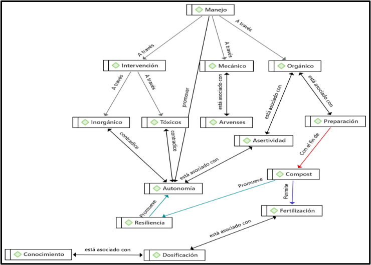 En la parte práctica se mencionan cada una de las formas de manejo y apropiación del uso del suelo, donde se resaltan las categorías mecánico y orgánico, lo que da cuenta de un proceso a su vez agroecológico alejado de procesos de intervención química, que de alguna otra manera podrían empezar a degradar el suelo. Como indica Contreras et al.(19), las prácticas agroecológicas tienen un impacto efectivo sobre la producción y la calidad del suelo, encontraste que las prácticas agroindustriales que causan un impacto negativo en el sistema agroforestal, de este modo, es vital fortalecer el uso de prácticas agroecológicas para fortalecer los procesos ecológicos del agroecosistema.