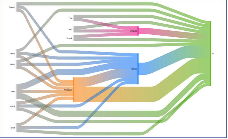 Las coocurrencias presentes en el diagrama hacen referencia a que el historial del uso del suelo es importante, aunque este factor no solo depende específicamente del cultivo inicial, sino que también de los procesos de manejo en la configuración del nuevo agroecosistema, esto se enlaza con lo apreciado por Garcia et al.(21) Según la intervención que se implemente en un agroecosistemas como contaminación, en consecuencia genera un cambio significativo; en el agua, o en la integridad ecológica, esto se traduce uso incorrecto del recurso natural.(22)