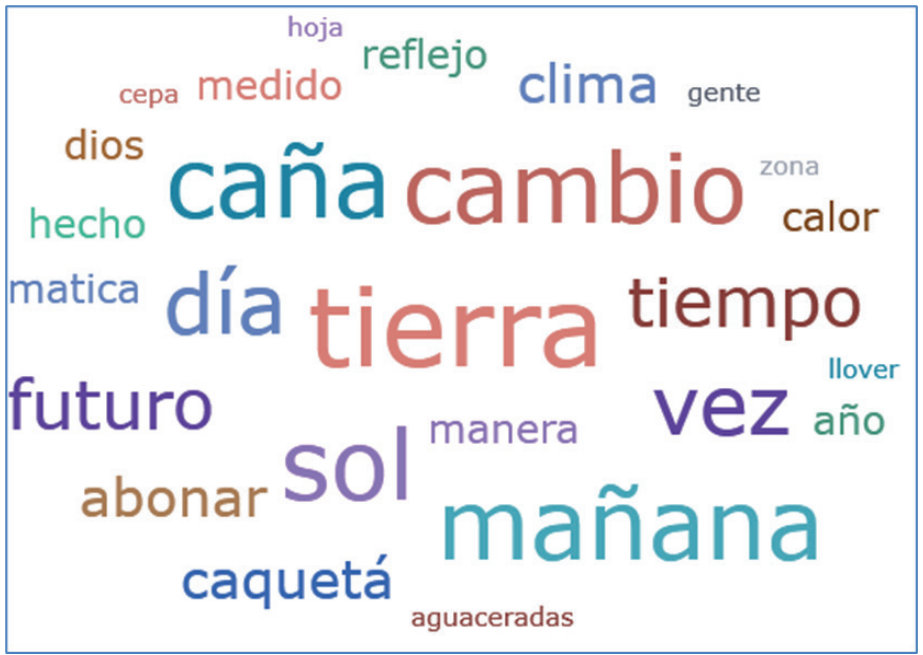 The most prominent terms were land, change, tomorrow, cane, and sun, suggesting a sentiment centered on working the land and the factors involved in the process. Other associated terms such as future, fertilize, Caquetá, time, and climate indicate recognition of the particular conditions of the environment and the impact of critical factors on the daily management and future of the land. This shows that landowners perceive climate variability as a factor that challenges the sustainability of their agricultural activities, generating uncertainty about the future and leading them to develop adaptation strategies(13) that must be evaluated.