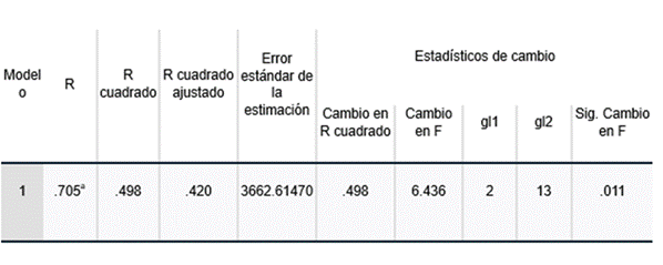 Next, we will continue with the analysis of the results obtained from the multiple linear regression performed in SPSS. figures 3, 4, 5 and 6 present the data corresponding to the testing of the general hypothesis, which will be examined in detail.