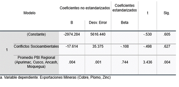 According to figure 5, the constant is -2974,284, but it is not statistically significant (p = 0,605). The coefficient for Socio-environmental Conflicts is -17,614, suggesting a negative relationship with mining exports. However, this coefficient is not statistically significant (p = 0,627). The coefficient for Regional Average GDP is 0,004, indicating a positive relationship with mining exports. This coefficient is statistically significant (p = 0,004).