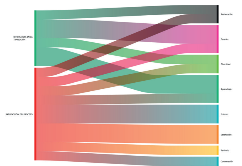 Atlas generated the Sankey diagram. Ti illustrates the co-occurrences between the category difficulties in the transition and satisfaction with the process, and the most co-occurring codes are restoration, species, diversity, and learning. The most representative co-occurrence between difficulties and satisfactions is species and learning because, according to the interviewee, it is tough to arrive at an environment where the behavior and requirements for the proper development of a species are not known. Therefore, one must begin to investigate and delve deeper into the subject, which is why learning is more often a source of difficulties than satisfaction; this can happen due to the producer's lack of knowledge on the subject.