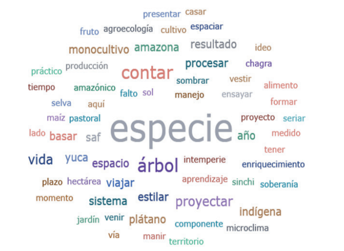 In figure 3, it was noted that throughout the interview, the producer emphasized on several occasions that if we want to make the transition, the first thing we have to do is to have a high diversity of species, whether they are timber trees or native fruit trees, and to plan to change our lifestyle, leaving monocultures behind in order to make production systems more practical. Therefore, these are the words that are most frequently encountered when applying the interview tool to the producer.